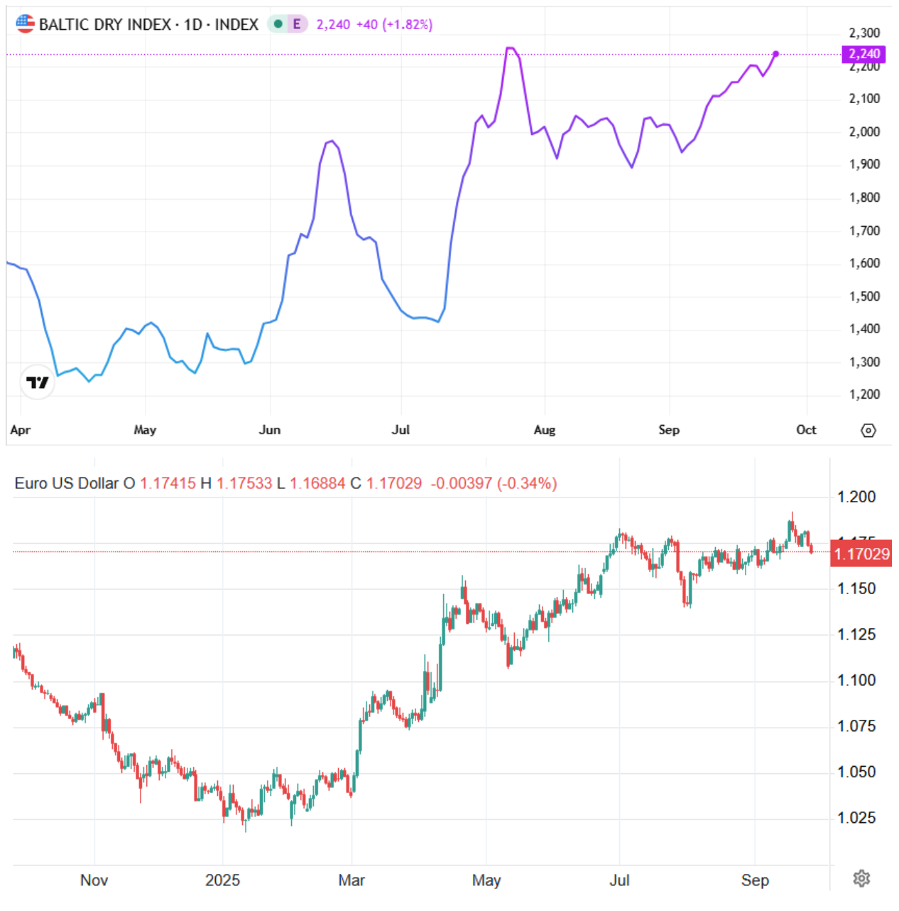 Shipping remains the pulse of global trade, with Asia playing a leading role. The Drewry World Container Index fell to $1,900/FEU, marking the 14th consecutive week of decline. Asia–Europe routes are under pressure from ship oversupply, despite delays due to the Red Sea detour. The Baltic Dry Index is moving upwards above 2,200 points, and we expect much higher levels, as we have emphasized for months, thanks to increased demand for Capesize ships transporting iron ore and coal to China. A correction down to 2,000 points or even 1,750 points is possible, but it would create the base for the continuation of the strong upward momentum we have pointed out.