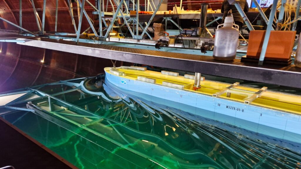 The project for next-generation methanol-powered vessels, currently under the project name Green Handy, is progressing as scheduled behind the scenes. Model tests have been carried out at the SSPA facility in Gothenburg to confirm that the vessel’s performance aligns with calculations.
