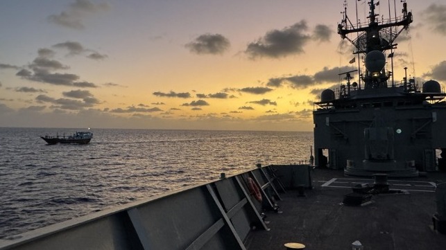 A combined task force of Indian Navy and EUNAVFOR assets tracked and reached the dhow on November 8-9. The responders did not conduct an opposed boarding, as the pirates were holding the dhow's crew hostage and threatened to hurt them, according to maritime risk consultancy Vanguard Tech. The threat to shipping was contained, but the standoff continued.