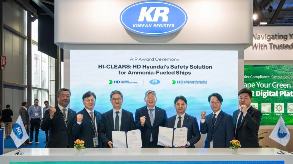 KR has granted Approval in Principle for the ammonia-fueled ship safety solution ‘Hi-CLEARS’. The system was developed in collaboration with HD Hyundai Heavy Industries and HD Korea Shipbuilding & Offshore Engineering and was announced on September 11 at Gastech 2025 in Milan, Italy.