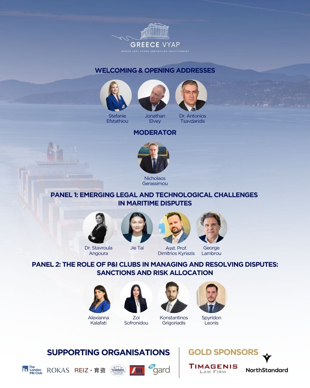 Greetings will be delivered, among others, by Jon Elvey, President of the London Maritime Arbitrators Association (LMAA), Dr. Antonios Tsavdaridis, Head of Arbitration at Rokas Law Firm, as well as Stefani Efstathiou, Co-Chair of Greece VYAP.