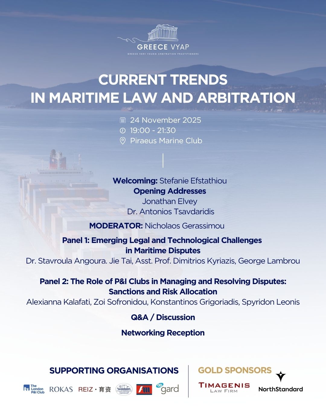 Greetings will be delivered, among others, by Jon Elvey, President of the London Maritime Arbitrators Association (LMAA), Dr. Antonios Tsavdaridis, Head of Arbitration at Rokas Law Firm, as well as Stefani Efstathiou, Co-Chair of Greece VYAP.