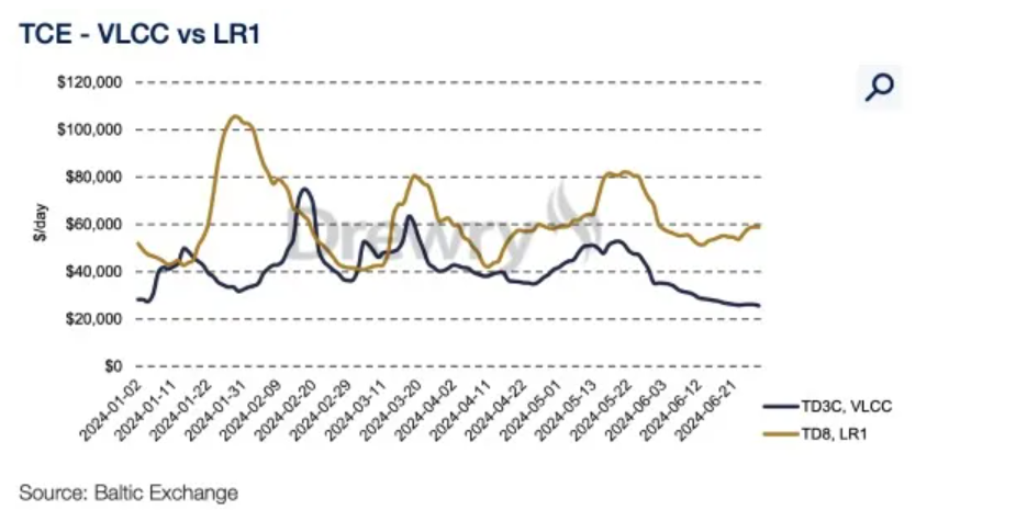 While LR rates are soaring due to tight supply, VLCC earnings are low amid subdued Chinese demand and production cuts by Middle Eastern producers. In June, the average TCE for LR1 plying on the AG-NW Europe route was about $55,000pd compared to the average TCE of $29,000pd for the VLCCs employed on the AG-China (TD3C) route. Higher charter rates in the LR market are inducing charterers to use VLCCs in the CPP trade. For instance, Trafigura – one of the major commodity traders – chartered a VLCC (Plata Glory) to transport diesel from the Arabian Gulf to Europe.